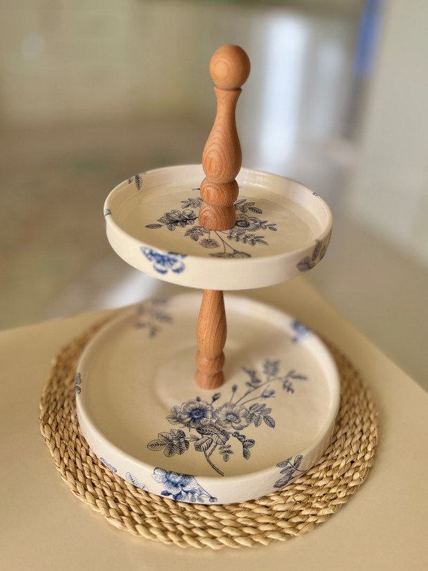 یک عدد شیرینی خوری دو طبقه - هولدر از جنس چوب راش - قطر سینی ها 20 و 27 سانتی متر